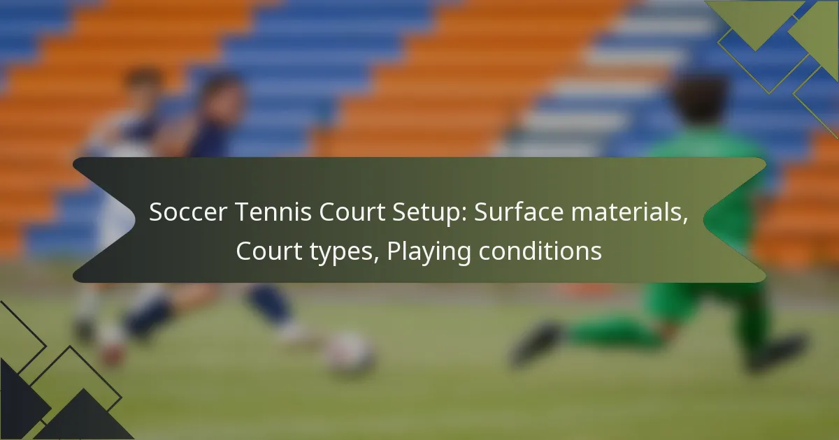 Setting up a soccer tennis court requires careful consideration of surface materials, which can include natural grass, artificial turf, clay, and hard court options. Each surface type offers unique characteristics that affect gameplay, maintenance, and player experience. Additionally, the choice of court type and the prevailing playing conditions, such as lighting and weather, play a crucial role in enhancing performance and enjoyment of the game.